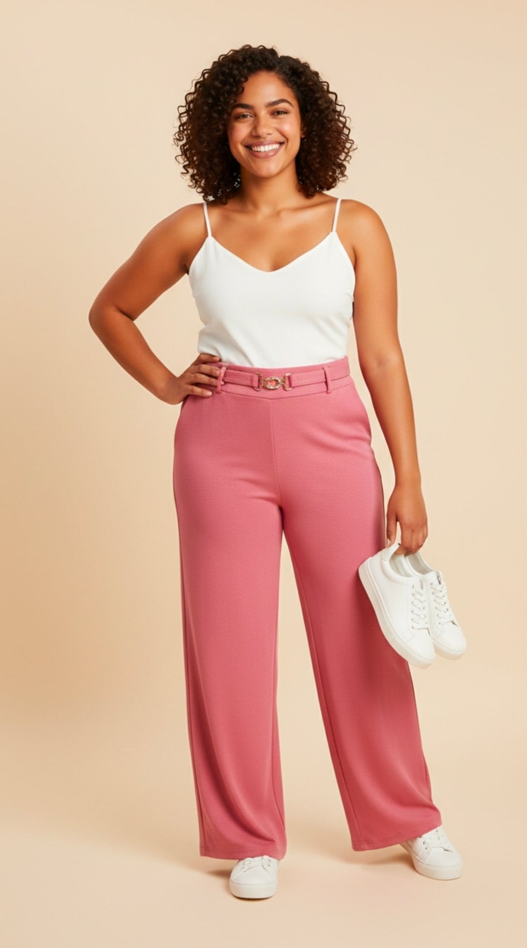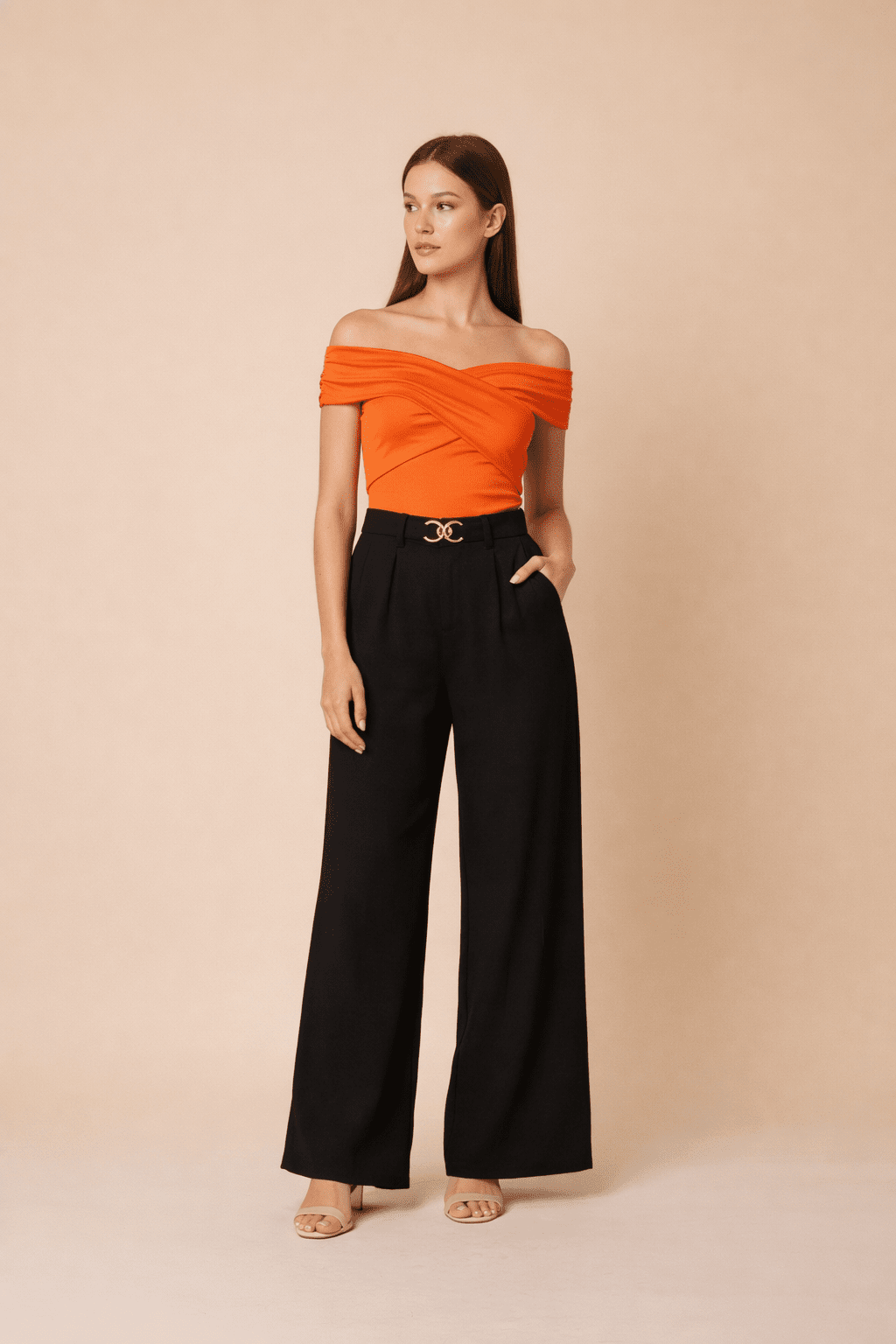 Cuenta con cintura alta estructurada que define la cintura y un detalle de hebilla metálica dorada al frente, que añade un toque chic y moderno. Su diseño versátil permite combinarlo fácilmente con blusas ajustadas, tops elegantes o camisas formales, ideal tanto para looks de día como de noche.