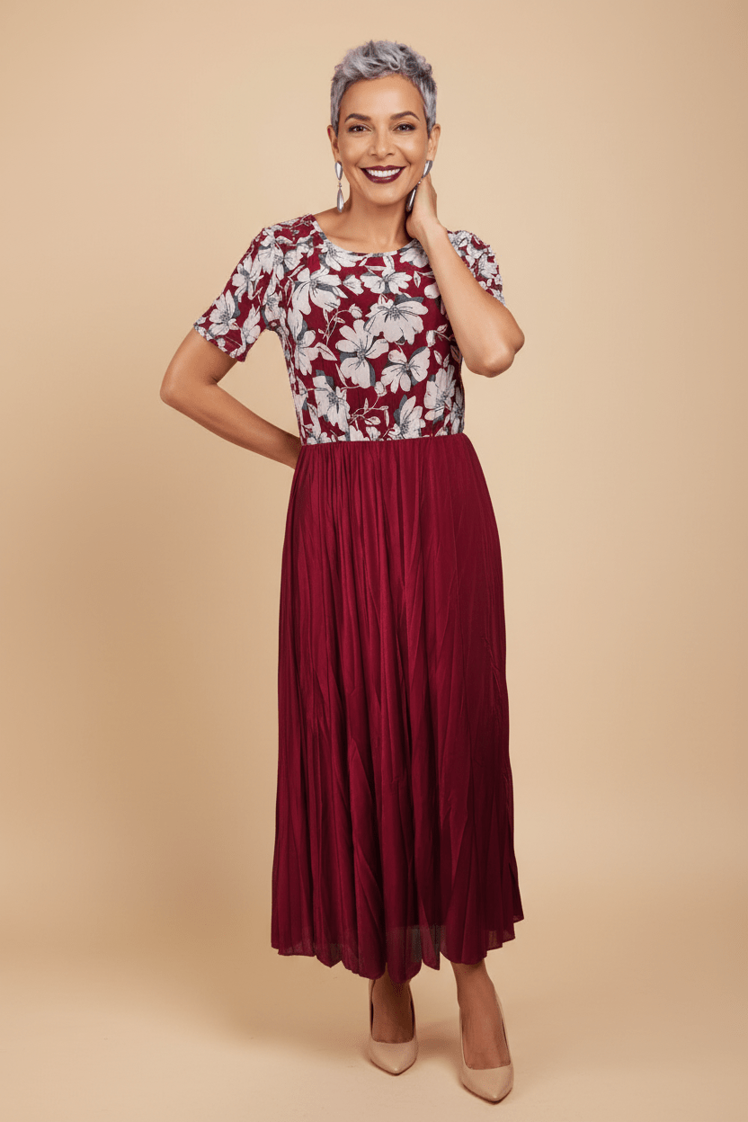Vestido Midi Floral Rojo con Falda Plisada