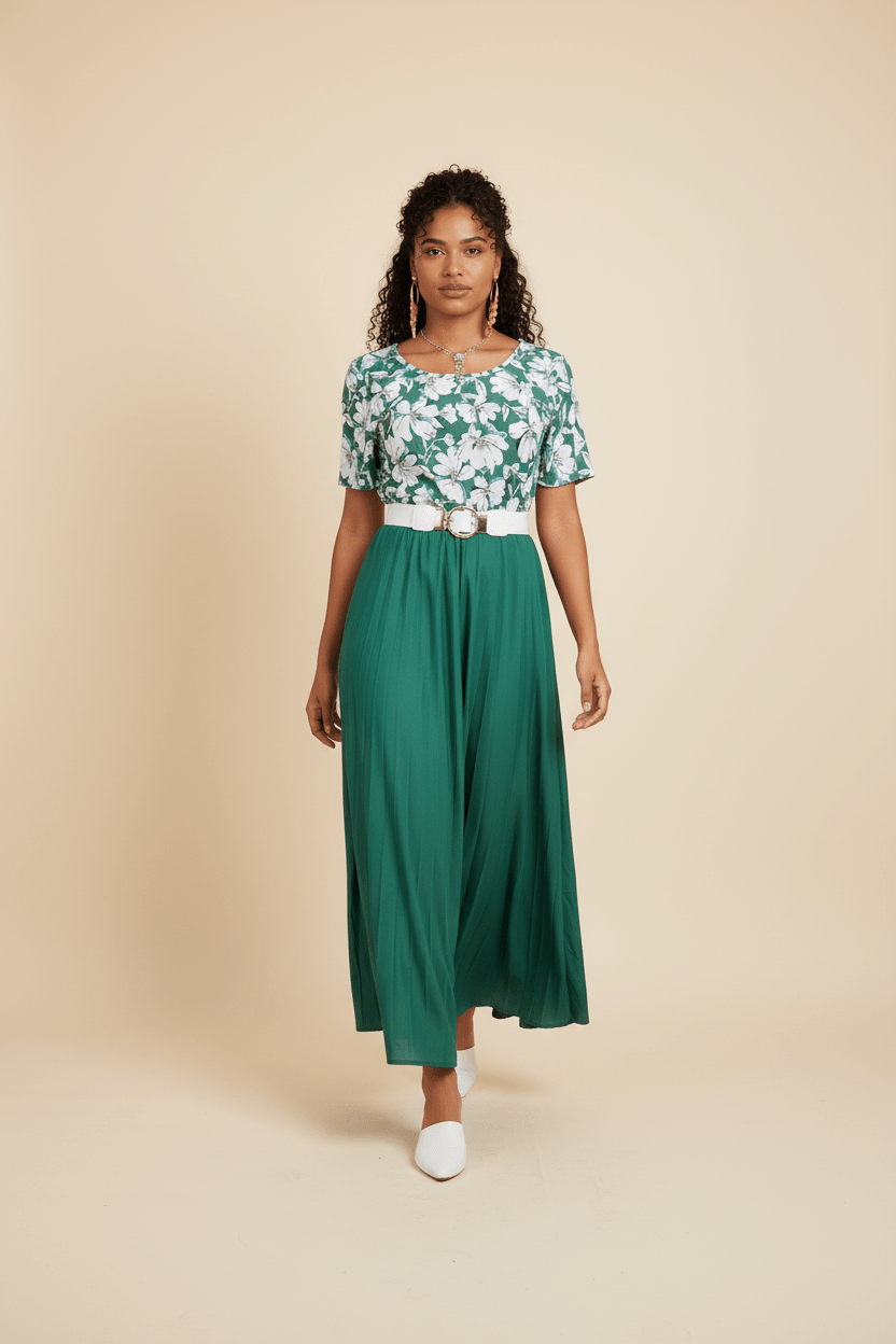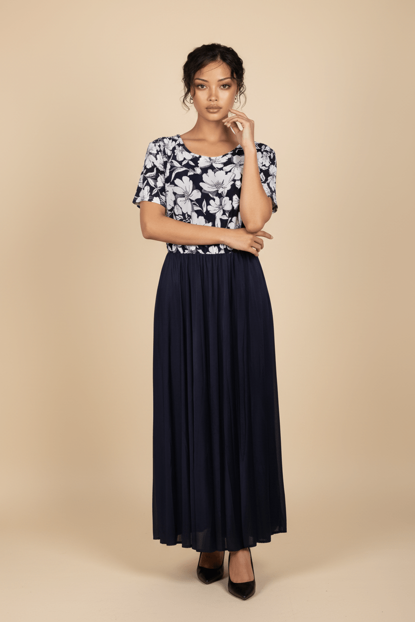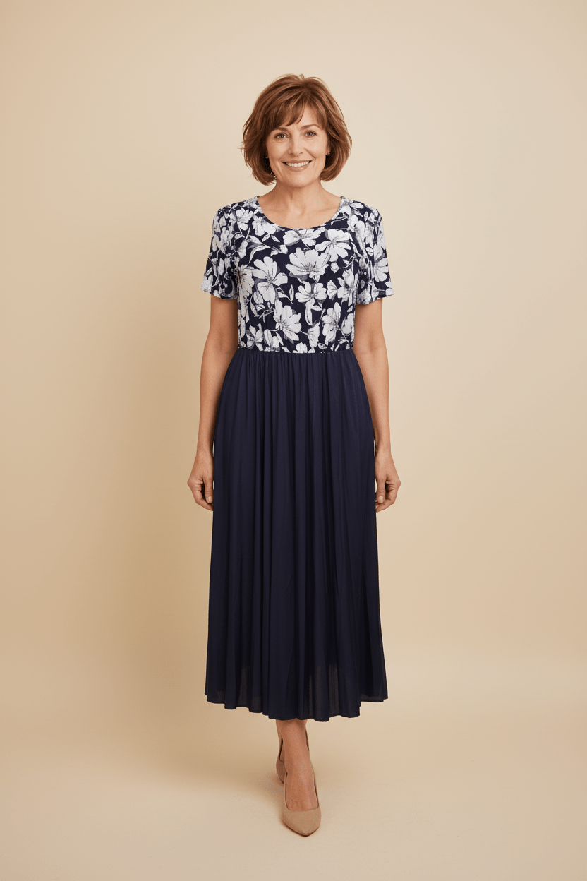 Este vestido midi combina a la perfección feminidad, comodidad y elegancia. Su parte superior presenta un delicado estampado floral en tonos blanco y rojo, con mangas cortas y escote redondo que realzan el área del busto de forma sutil y favorecedora.