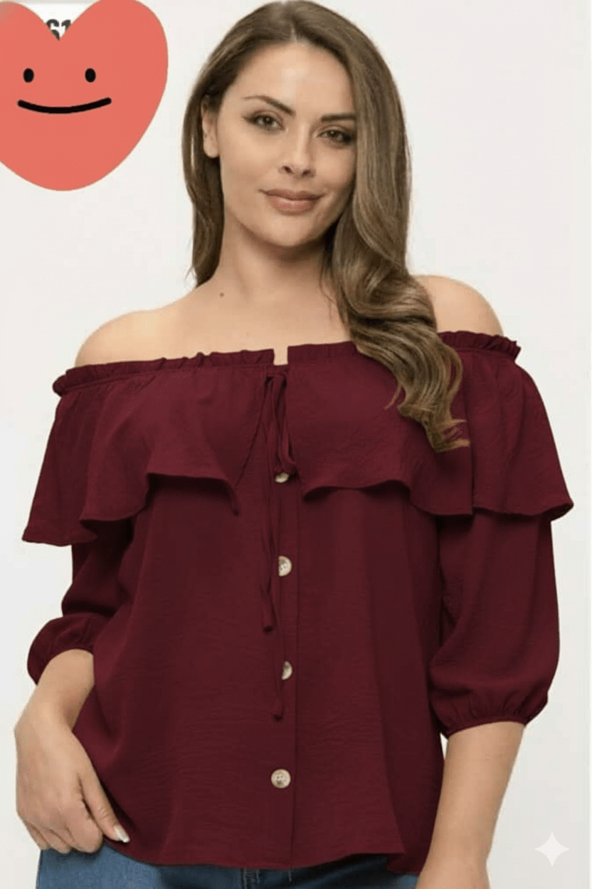 Blusa estilo off-shoulder en tono negro y beige camel, perfecta para un look fresco, femenino y elegante. Presenta un volante amplio que cae delicadamente sobre el pecho, añadiendo movimiento y un toque romántico. Incluye botones decorativos al frente y un lazo ajustable en el escote para un fit cómodo. Sus mangas 3/4 con elástico dan un acabado moderno y favorecedor. Ideal para combinar con jeans, pantalones blancos o faldas para un look chic y versátil.
