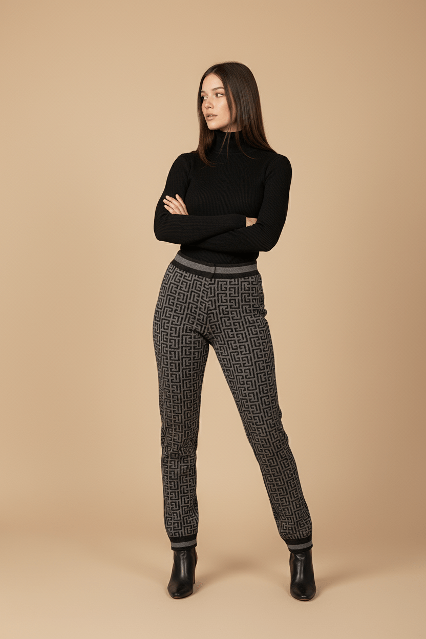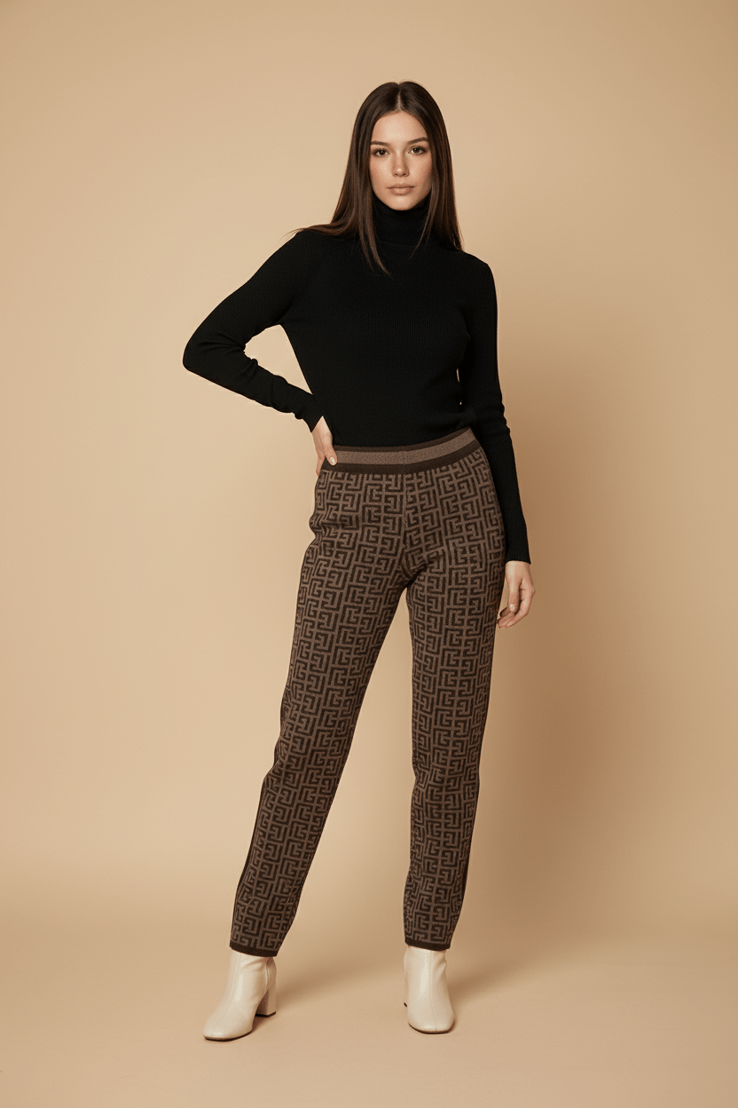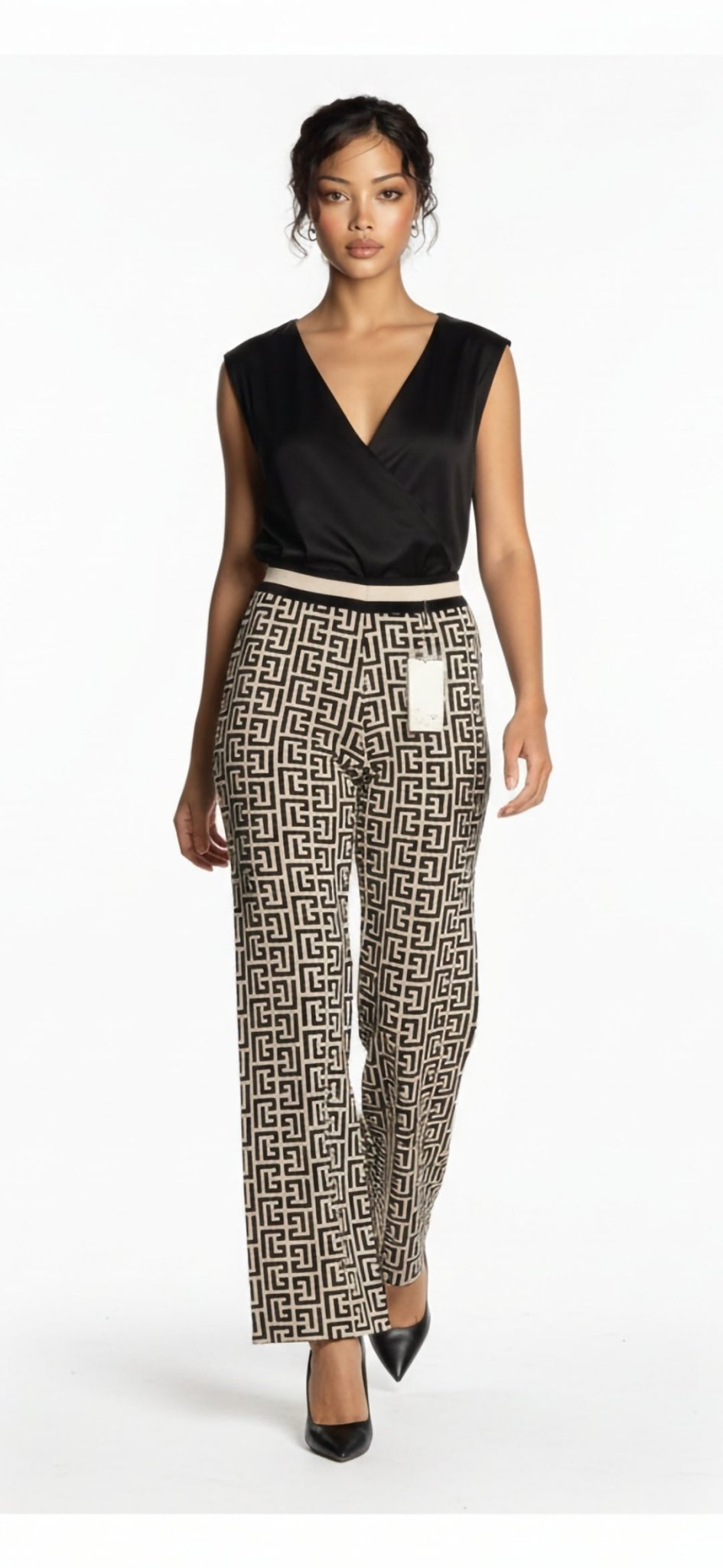 Eleva tu estilo con este pantalón palazzo de diseño geométrico que combina sofisticación y comodidad en una sola pieza. Su estampado moderno en tonos neutros aporta un look elegante y atemporal, perfecto tanto para outfits casuales chic como para ocasiones más formales.